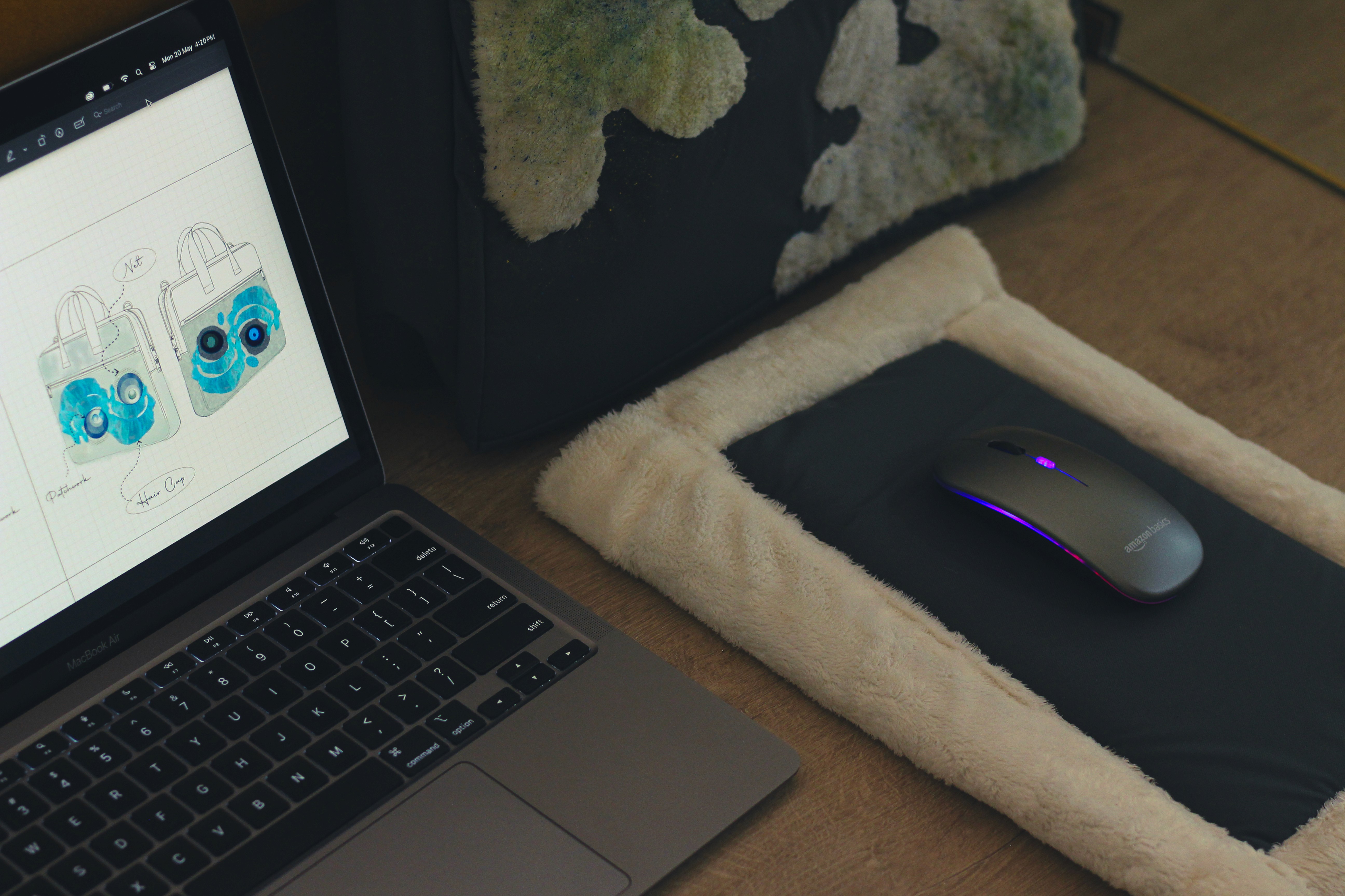 Designed a new laptop bag is a stylish, multifunctional companion for modern nomads. It features a cushioned compartment that doubles as back support or a pillow, a waterproof exterior, and a surface of soft fur for comfort. The bag also works as a mouse pad and offers customizable spray-paintable fur that can absorb perfumes or deodorants, providing both personalization and a soothing aroma for naps or travel.